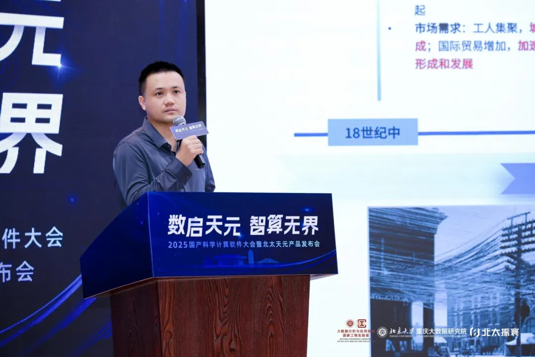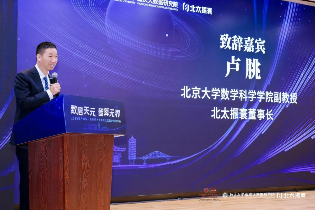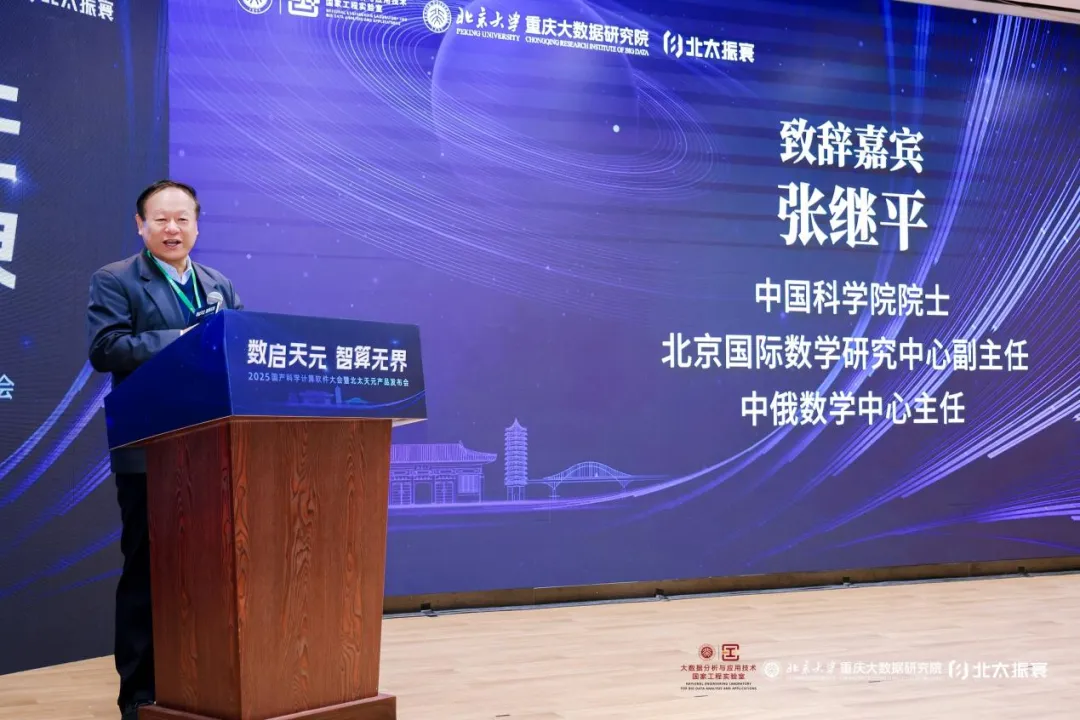 北京大学数学科学学院党委书记、北京大学重庆大数据研究院院长胡俊教授代表院校及合作单位向与会嘉宾致欢迎辞,并系统阐述了研究院“以推动应用数学成果转化为关键纽带,服务国家战略需求、支撑地方发展实践”的核心使命。他着重阐释,研究院创新“高校+校内组织机构+异地科研机构+企业”的四位一体的科技成果转化模式,打通了数学学科从基础研究到落地应用的全链条——北太天元与北达飞易,正是这一机制孵化出的标志性成果。他分享了自身将授课教材改为北太天元的实践,呼吁各界持续关注、使用和支持国产软件,助力其长期打磨成长。