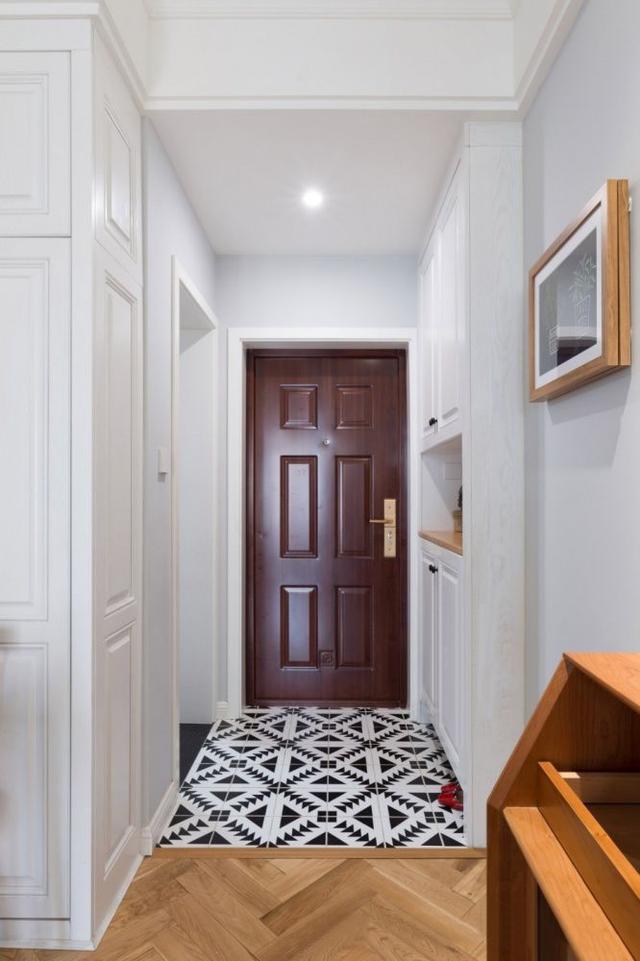 玄关稍微比较小,但该有的功能还是都有的,嵌入式的鞋柜不仅满足了日常的收纳,还能让整体空间显得更为美观。地面选用花砖进行铺设,清理起来方便,也可以作为与客厅的分隔。